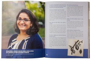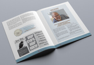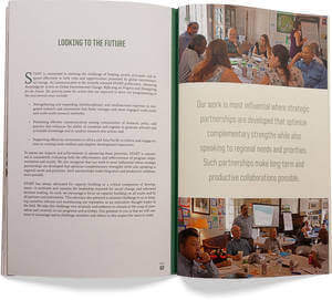 Coding, design, photography, and print buying for a web-based annual report and printed companion piece with a sampling of the content to drive traffic online. The annual report features campaign buttons.