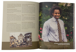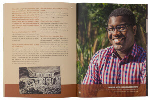 Coding, design, photography, and print buying for a web-based annual report and printed companion piece with a sampling of the content to drive traffic online. The annual report features campaign buttons.